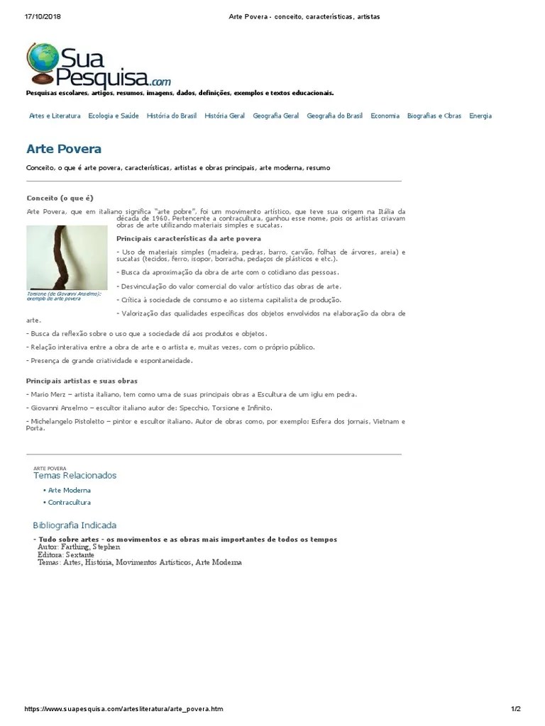 Cette exposition marque le point de départ du mouvement italien, caractérisée par la pauvreté de ses matériaux et des techniques utilisées. L' arte povera ou la guérilla comme stratégie de l'art.. 04/03/2015 · principais características da arte povera.