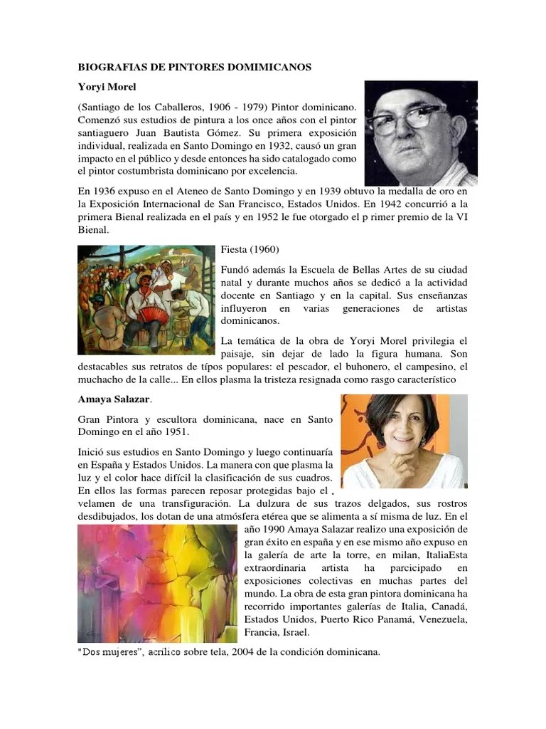 Artelista.com es la mayor comunidad de personas interesadas en el arte que existe en internet de forma gratuita.. Los pintores dominicanos, con influencias y orígenes diversos, han hecho de su país uno de los más ricos y fascinantes en cuanto a producción artística, no solo en la región caribeña, sino a nivel continental.desde cuadros costumbristas hasta composiciones reveladoras, la obra de los artistas dominicanos destaca por la determinación de sus pinceladas, la riqueza de técnicas y la... Arte y artistas dominicanos de las artes visuales componentes …