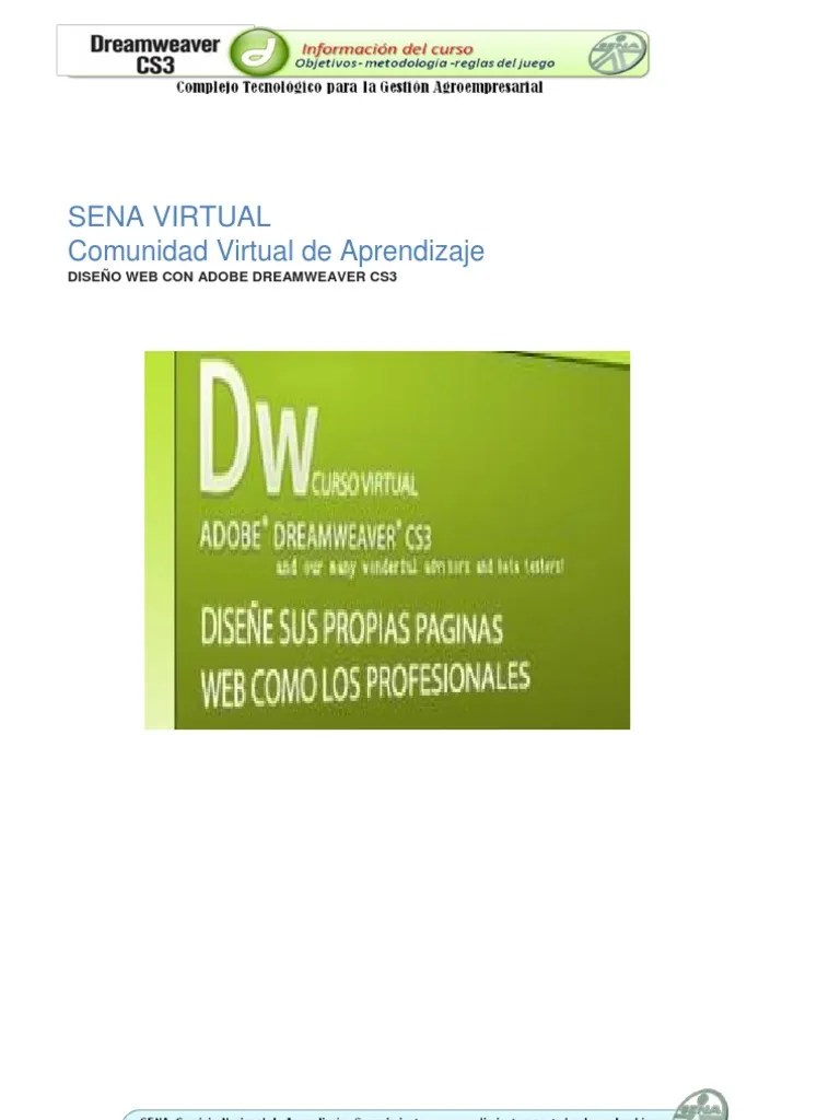 Este programa facilitará la edición y creación de los sitios que el.. Diseño web con macromedia dreamweaver mx manejo de adobe photoshop manejo de herramientas informáticas: Carreras virtuales en el sena. Es usado básicamente para la elaboración de páginas y sitios web, los cuales están orientadas a cumplir ciertos estándares de la world wide consortium. Especificaciones sena curso diseño web adobe dreamweaver. Como tal, esta propuesta de estudio lleva por nombre curso sena diseño web adobe dreamweaver. Diseño web con adobe dreamweaver. Higiene y manipulación de alimentos sena; Curso sobre diseño web con adobe dreamweaver.. Como tal, esta propuesta de estudio lleva por nombre curso sena diseño web adobe dreamweaver.
